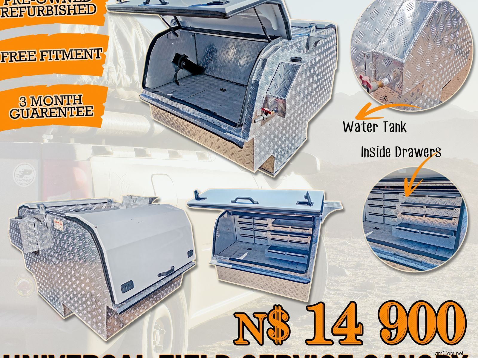 Description: Field Service Workers Canopy Brand : Taurus Color : White & Aluminium Silver Price : N$ 14 900 Fitment Included Status : Pre-Owned Refurbished Mobile Fitment can be done on your own premises - T's & C's Apply All our Refurbished Canopies we give 3 Month Guarantee! We are Located in Brakwater - Park and Sell Premises, Next to IN+GO Storage