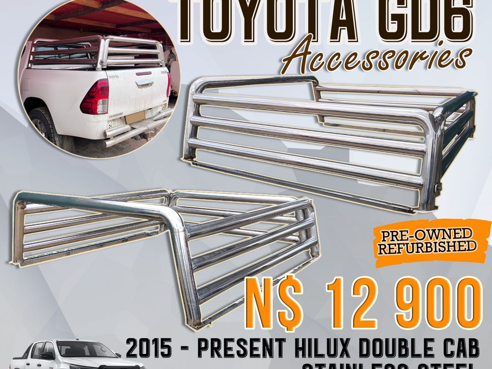 Description: Toyota GD6 Double Cab Refurbished Stainless steel Cattle Rails | Trallies Price : N$12 900 Fitment Included Mobile Fitment can be done on your own premises - T's & C's Apply All our Refurbished Canopies we give 3 Month Guarantee! Located in Brakwater on Park and Sell Premises next to IN + GO Storage