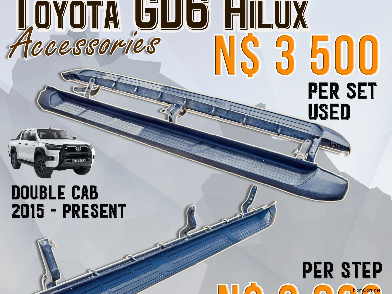 Description: GD6 Double Cab SIDE STEP | RUNNING BOARDS Available Running Board SET Used - N$ 3 500 or Running Board - N$ 3 800 EACH ???? Contact us today: ????Land Line : 083 723 3308 ???? Dries: 081 712 7706 ???? Mardien: 081 827 7844 ???? Visit us in Brakwater – Same premises as Park and Sell, next to IN+GO Storages & Namcon Logistics. ???? Quality & Affordability – Don’t Miss Out! ????