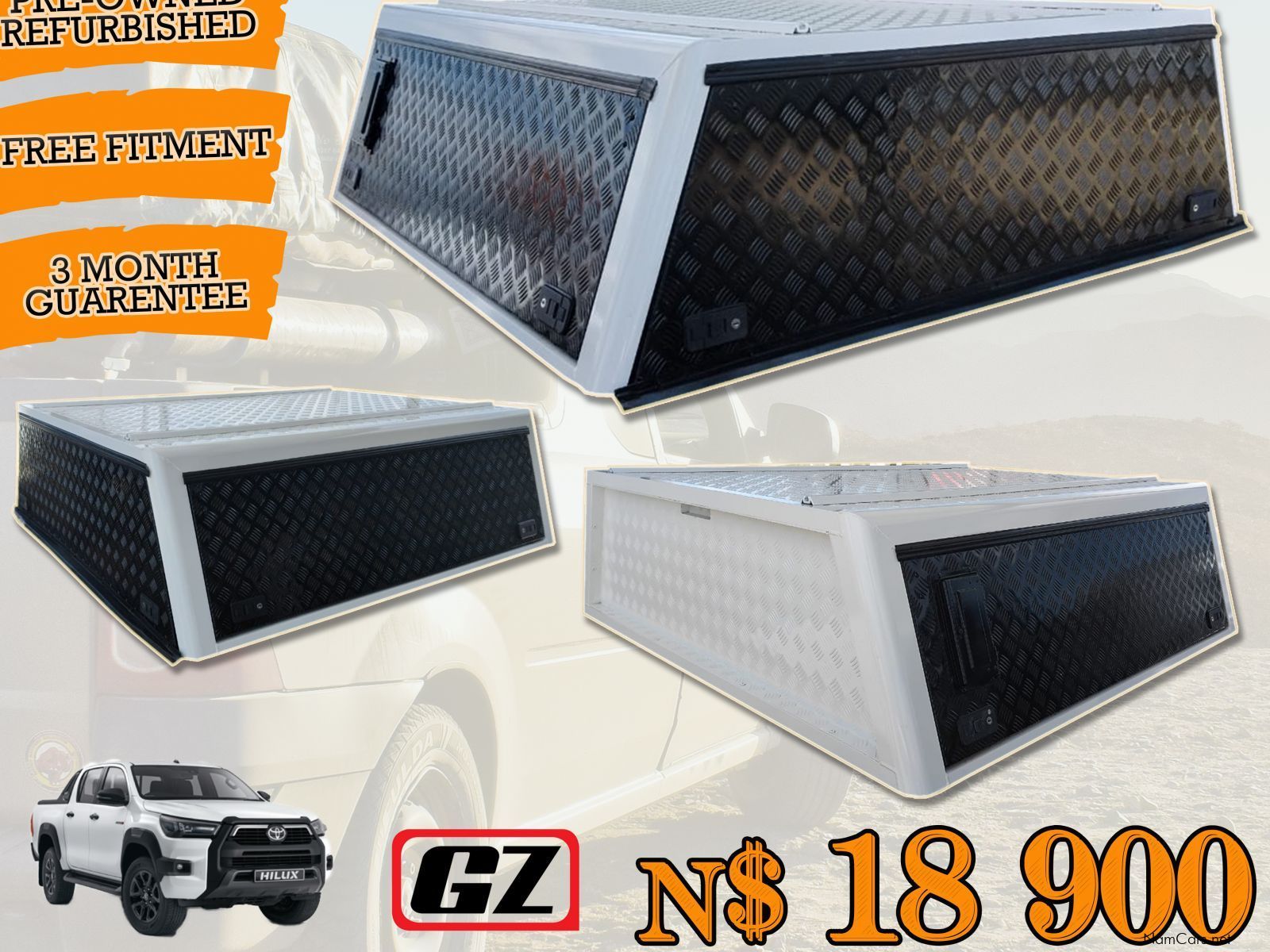 Description: Toyota Hilux GD6 Double Cab Ground Zero Aluminium Canopy Brand : Ground Zero Color : Black & White Price : N$ 18 900 Fitment Included Mobile Fitment can be done on your own premises - T's & C's Apply All our Refurbished Canopies we give 3 Month Guarantee!